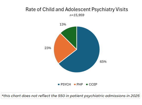 The CCPEP provides three types of care: emergency psychiatric evaluation, brief 72-hour admissions in our Extended Observation Unit, and follow-up services after discharge from CCPEP in the Interim Crisis Clinic. Bellevue is one of very few hospitals where an experienced child and adolescent psychiatrist and nursing team is on-site 24 hours a day, 365 days per year to serve and families in crisis. In 2025, our CCPEP program had 320 patients with a total of 2006 visits.